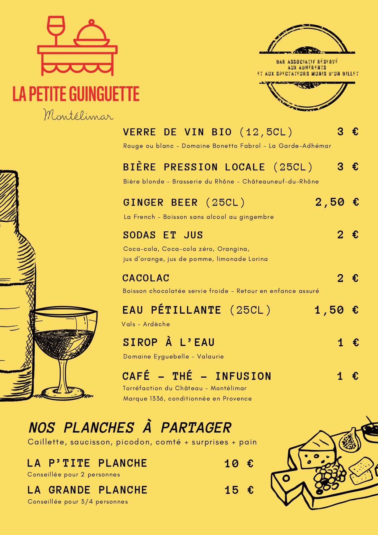 En venant à La Petite Scène, vous pouvez également profiter de l’espace « La Petite Guinguette » pour boire un verre et manger un morceau avant et après les représentations. C’est simple, bon, convivial… et pas cher !